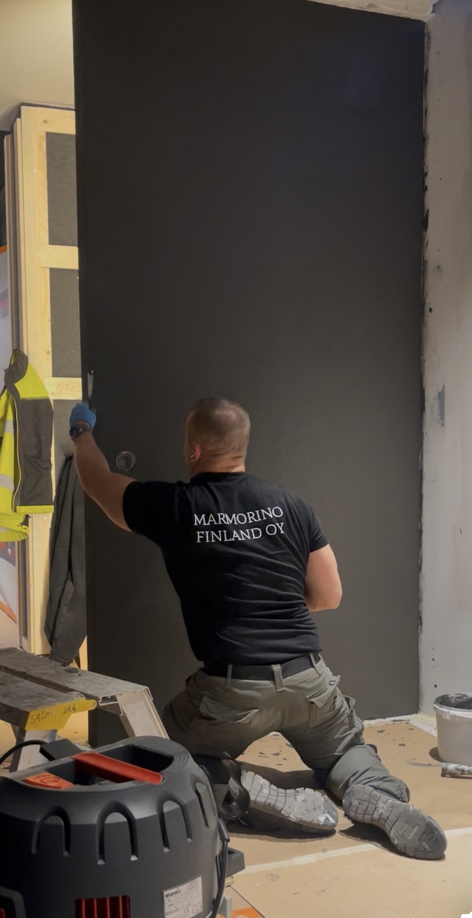 Työt alkavat aina huolellisella tilojen pintojen suojaamisella, jolla varmistetaan ettei muihin pintoihin tule kolhuja eikä sotkuja käytetyistä laasteista ja maaleista.